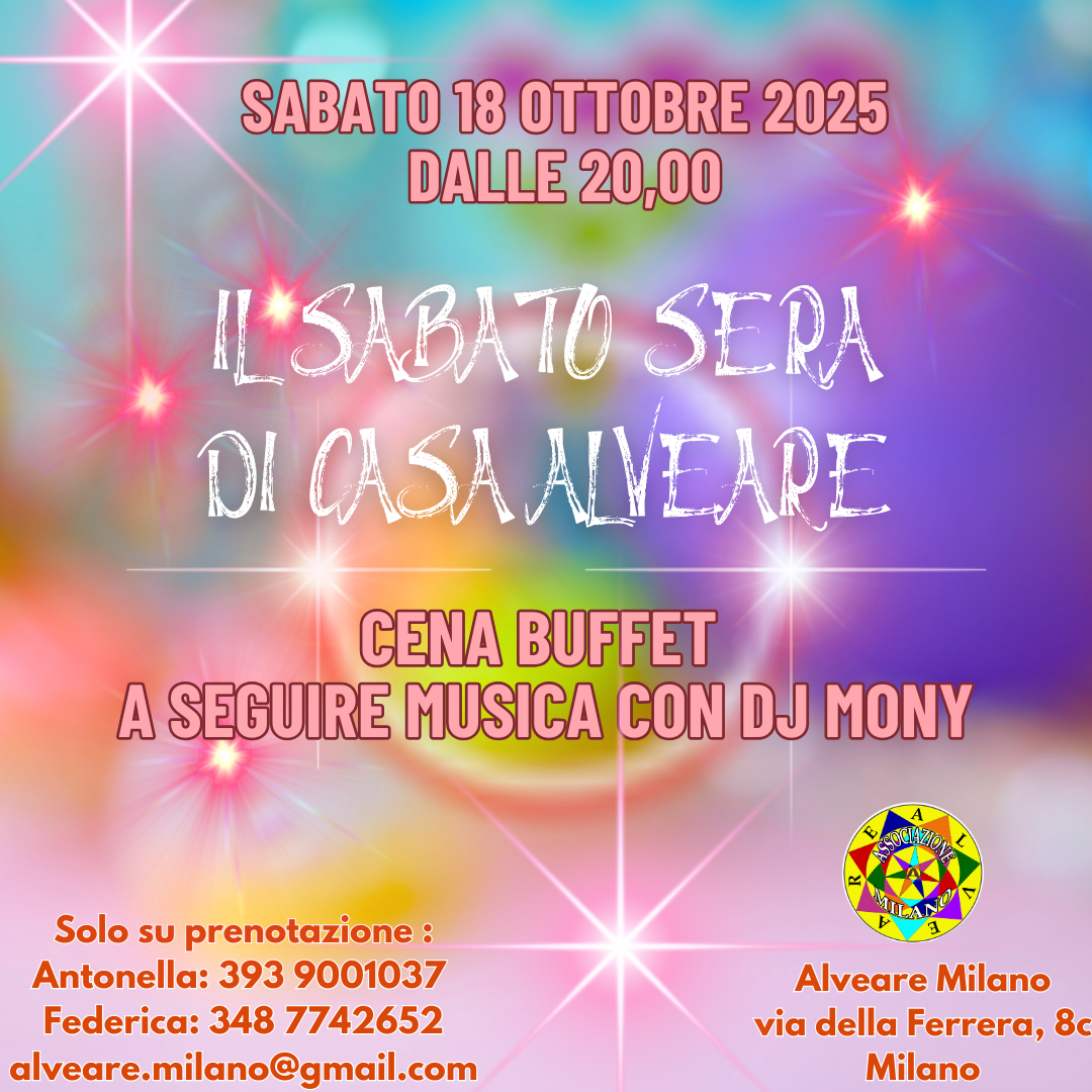 IL SABATO SERA DI CASA ALVEARE CENA A BUFFET DEL SABATO A SEGUIRE MUSICA CON DJ MONYDate: Sabato, 18 Ottobre, 2025 - 20:00Immagine: